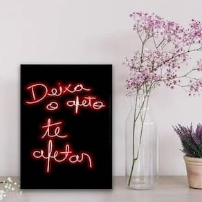Quadro decorativo deixa o afeto te afetar 33x24cm Moldura: madeira branca Informações do produto tire todas as suas dúvidas no descritivo abaixo: decoração para quarto, sala, cozinha, escritório, área gourmet e muito mais. Chega de paredes vazias medidas - cada peça tem 33x24cm a4 . Material do papel - papel fotográfico brilhante de altíssima resolução acabamento - todos os quadros são acompanhados de uma película de acetato para proteção da imagem. - os quadros são embalados de forma segura com plástico bolha com camada dupla de acordo com o tamanho dos quadros. Garantia - garantia de 3 meses. Meu quadro chegou. Como posso fixá-lo Você precisa apenas de um martelo e um prego, pois os quadros já vão acompanhados de penduradores. Esta é a forma mais indicada. Caso prefira, você pode utilizar uma fita dupla face neste caso, sugerimos de alta qualidade para evitar que descole e seu quadro caia . Como posso limpar meu quadro A limpeza é feita como um móvel comum da sua casa. Apenas um pano seco ou espanador são suficientes para tal Ean: 7896319960189