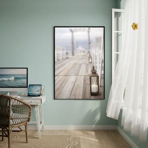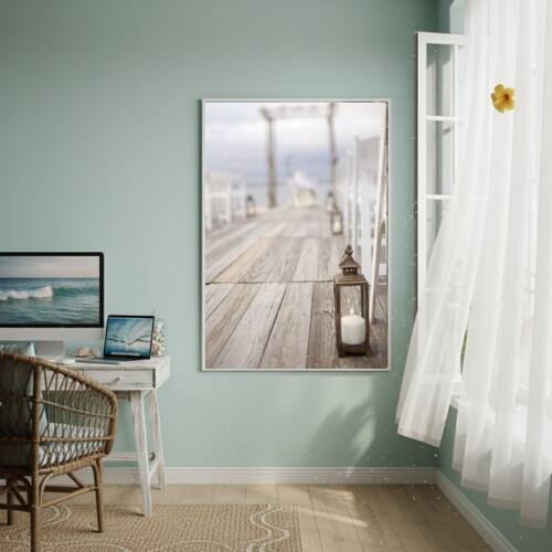 Quadro Decorativo Deque De Madeira-70x50cm - Cor: Moldura Branca