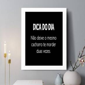 Quadro decorativo dica do dia 45x34cm - com vidro Cor: moldura preta Informações do produto tire todas as suas dúvidas no descritivo abaixo: decoração para quarto, sala, cozinha, escritório, área gourmet e muito mais. Chega de paredes vazias medidas - cada peça tem 45x34cm a3 . Material do papel - papel fotográfico brilhante de altíssima resolução acabamento - todos os quadros são acompanhados de vidro para proteção da imagem. - moldura em madeira maciça na cor preta ou branca conforme produto escolhido e pendurador . - os quadros são embalados de forma segura com plástico bolha com camada dupla de acordo com o tamanho dos quadros. Garantia - garantia de 3 meses. Meu quadro chegou. Como posso fixá-lo Você precisa apenas de um martelo e um prego, pois os quadros já vão acompanhados de penduradores. Esta é a forma mais indicada. Como posso limpar meu quadro A limpeza é feita como um móvel comum da sua casa. Apenas um pano seco ou espanador são suficientes para tal