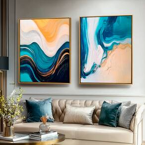 Quadro Decorativo Duo Abstrato Ondas Suave Moldura Preta e Vidro - 84x54 -