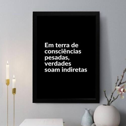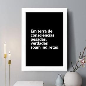 Quadro decorativo em terra de consciências pesadas 33x24cm - com vidro Cor: moldura branca Informações do produto tire todas as suas dúvidas no descritivo abaixo: decoração para quarto, sala, cozinha, escritório, área gourmet e muito mais. Chega de paredes vazias medidas - cada peça tem 33x24cm a4 . Material do papel - papel fotográfico brilhante de altíssima resolução acabamento - todos os quadros são acompanhados de vidro para proteção da imagem. - moldura em madeira maciça na cor preta ou branca conforme produto escolhido e pendurador . - os quadros são embalados de forma segura com plástico bolha com camada dupla de acordo com o tamanho dos quadros. Garantia - garantia de 3 meses. Meu quadro chegou. Como posso fixá-lo Você precisa apenas de um martelo e um prego, pois os quadros já vão acompanhados de penduradores. Esta é a forma mais indicada. Como posso limpar meu quadro A limpeza é feita como um móvel comum da sua casa. Apenas um pano seco ou espanador são suficientes para tal