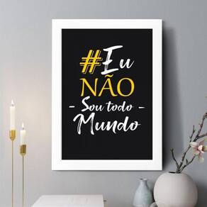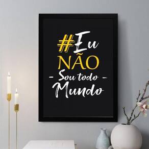 Quadro decorativo eu não sou todo mundo 33x24cm Cor: moldura preta Informações do produto tire todas as suas dúvidas no descritivo abaixo: decoração para quarto, sala, cozinha, escritório, área gourmet e muito mais. Chega de paredes vazias medidas - cada peça tem 33x24cm a4 . Material do papel - papel fotográfico brilhante de altíssima resolução acabamento - todos os quadros são acompanhados de uma película de acetato para proteção da imagem. - os quadros são embalados de forma segura com plástico bolha com camada dupla de acordo com o tamanho dos quadros. - de 3 meses. Meu quadro chegou. Como posso fixá-lo Você precisa apenas de um martelo e um prego, pois os quadros já vão acompanhados de penduradores. Esta é a forma mais indicada. Caso prefira, você pode utilizar uma fita dupla face neste caso, sugerimos de alta qualidade para evitar que descole e seu quadro caia . Como posso limpar meu quadro A limpeza é feita como um móvel comum da sua casa. Apenas um pano seco ou espanador são suficientes para tal Marca: Não Informado