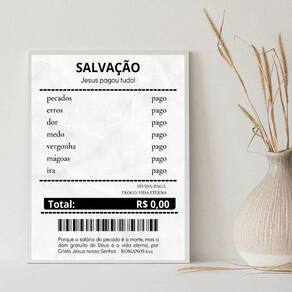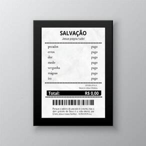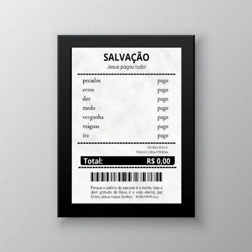 Quadro decorativo evangélico recibo 45x34cm Moldura: madeira preta Informações do produto tire todas as suas dúvidas no descritivo abaixo: decoração para quarto, sala, cozinha, escritório, área gourmet e muito mais. Chega de paredes vazias. Medidas - cada peça tem 45x34cm a3 . Material do papel - papel fotográfico brilhante de altíssima resolução acabamento - todos os quadros são acompanhados de uma película de acetato para proteção da imagem. - os quadros são embalados de forma segura com plástico bolha com camada dupla de acordo com o tamanho dos quadros. Garantia - garantia de 3 meses. Meu quadro chegou. Como posso fixá-lo Você precisa apenas de um martelo e um prego, pois os quadros já vão acompanhados de penduradores. Esta é a forma mais indicada. Caso prefira, você pode utilizar uma fita dupla face neste caso, sugerimos de alta qualidade para evitar que descole e seu quadro caia . Como posso limpar meu quadro A limpeza é feita como um móvel comum da sua casa. Apenas um pano seco ou espanador são suficientes para tal Ean: 7896370544649