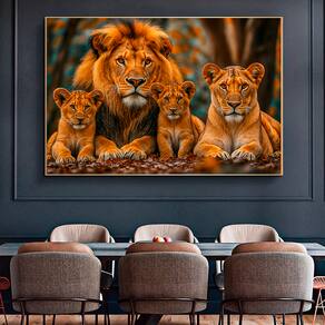 Quadro Decorativo Família De Leões Centrada Moldura Dourada - 84x54cm -