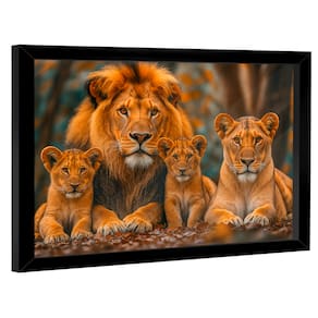 Quadro Decorativo Família De Leões Centrada Moldura Preta e Vidro - 180x105cm -