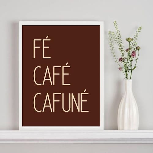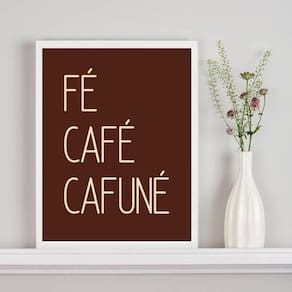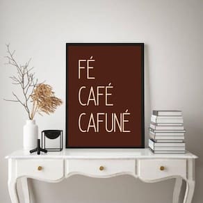 Quadro decorativo fé café cafuné - marrom 24x18cm - com vidro Cor: moldura branca Informações do produto tire todas as suas dúvidas no descritivo abaixo: decoração para quarto, sala, cozinha, escritório, área gourmet e muito mais. Chega de paredes vazias medidas - cada peça tem 24x18cm a5 . Material do papel - papel fotográfico brilhante de altíssima resolução acabamento - todos os quadros são acompanhados de vidro para proteção da imagem. - moldura em madeira maciça na cor preta ou branca conforme produto escolhido e pendurador . - os quadros são embalados de forma segura com plástico bolha com camada dupla de acordo com o tamanho dos quadros. - de 3 meses. Meu quadro chegou. Como posso fixá-lo Você precisa apenas de um martelo e um prego, pois os quadros já vão acompanhados de penduradores. Esta é a forma mais indicada. Como posso limpar meu quadro A limpeza é feita como um móvel comum da sua casa. Apenas um pano seco ou espanador são suficientes para tal