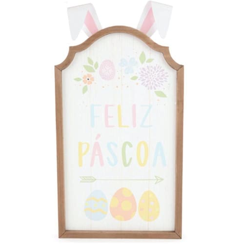 Material: Madeira e metal, oferecendo uma combinação de texturas e durabilidade. Medidas Aproximadas: Comprimento: 46,7 cm Largura: 25 cm Design: Inclui a frase Feliz Páscoa com um detalhe de orelha, ideal para transmitir um espírito festivo e alegre.