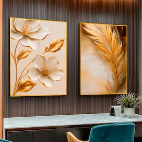 Quadro Decorativo Flor e Folha Dourada Duo Moldura Dourada - 84x54cm -