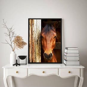 Quadro decorativo fotografia cavalo na baia 33x24cm Moldura: madeira preta Informações do produto tire todas as suas dúvidas no descritivo abaixo: decoração para quarto, sala, cozinha, escritório, área gourmet e muito mais. Chega de paredes vazias medidas - cada peça tem 33x24cm a4 . Material do papel - papel fotográfico brilhante de altíssima resolução acabamento - todos os quadros são acompanhados de uma película de acetato para proteção da imagem. - os quadros são embalados de forma segura com plástico bolha com camada dupla de acordo com o tamanho dos quadros. Garantia - garantia de 3 meses. Meu quadro chegou. Como posso fixá-lo Você precisa apenas de um martelo e um prego, pois os quadros já vão acompanhados de penduradores. Esta é a forma mais indicada. Caso prefira, você pode utilizar uma fita dupla face neste caso, sugerimos de alta qualidade para evitar que descole e seu quadro caia . Como posso limpar meu quadro A limpeza é feita como um móvel comum da sua casa. Apenas um pano seco ou espanador são suficientes para tal Ean: 7894463765025