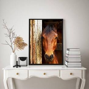 Quadro decorativo fotografia cavalo na baia 45x34cm Moldura: madeira preta Informações do produto tire todas as suas dúvidas no descritivo abaixo: decoração para quarto, sala, cozinha, escritório, área gourmet e muito mais. Chega de paredes vazias. Medidas - cada peça tem 45x34cm a3 . Material do papel - papel fotográfico brilhante de altíssima resolução acabamento - todos os quadros são acompanhados de uma película de acetato para proteção da imagem. - os quadros são embalados de forma segura com plástico bolha com camada dupla de acordo com o tamanho dos quadros. Garantia - garantia de 3 meses. Meu quadro chegou. Como posso fixá-lo Você precisa apenas de um martelo e um prego, pois os quadros já vão acompanhados de penduradores. Esta é a forma mais indicada. Caso prefira, você pode utilizar uma fita dupla face neste caso, sugerimos de alta qualidade para evitar que descole e seu quadro caia . Como posso limpar meu quadro A limpeza é feita como um móvel comum da sua casa. Apenas um pano seco ou espanador são suficientes para tal Ean: 7894501686893