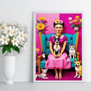 Quadro decorativo frida com cães e gatos 24x18cm Cor: moldura branca Informações do produto tire todas as suas dúvidas no descritivo abaixo: decoração para quarto, sala, cozinha, escritório, área gourmet e muito mais. Chega de paredes vazias medidas - cada peça tem 24x18cm a5 . Material do papel - papel fotográfico brilhante de altíssima resolução acabamento - todos os quadros são acompanhados de uma película de acetato para proteção da imagem. - os quadros são embalados de forma segura com plástico bolha com camada dupla de acordo com o tamanho dos quadros. Garantia - garantia de 3 meses. Meu quadro chegou. Como posso fixá-lo Você precisa apenas de um martelo e um prego, pois os quadros já vão acompanhados de penduradores. Esta é a forma mais indicada. Caso prefira, você pode utilizar uma fita dupla face neste caso, sugerimos de alta qualidade para evitar que descole e seu quadro caia . Como posso limpar meu quadro A limpeza é feita como um móvel comum da sua casa. Apenas um pano seco ou espanador são suficientes para tal Ean: 7891234532541