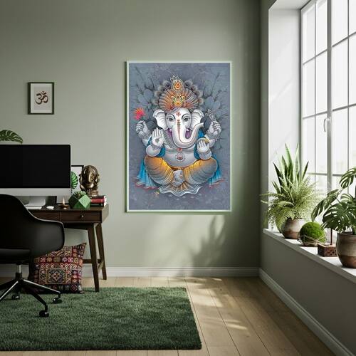 Quadro Decorativo Ganesha Fundo Cinza - 70x50cm - Cor: Moldura Branca