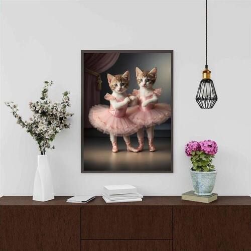Quadro decorativo gatinhas bailarinas 45x34cm Cor: moldura preta Informações do produto tire todas as suas dúvidas no descritivo abaixo: decoração para quarto, sala, cozinha, escritório, área gourmet e muito mais. Chega de paredes vazias. Medidas - cada peça tem 45x34cm a3 . Material do papel - papel fotográfico brilhante de altíssima resolução acabamento - todos os quadros são acompanhados de uma película de acetato para proteção da imagem. - os quadros são embalados de forma segura com plástico bolha com camada dupla de acordo com o tamanho dos quadros. - de 3 meses. Meu quadro chegou. Como posso fixá-lo Você precisa apenas de um martelo e um prego, pois os quadros já vão acompanhados de penduradores. Esta é a forma mais indicada. Caso prefira, você pode utilizar uma fita dupla face neste caso, sugerimos de alta qualidade para evitar que descole e seu quadro caia . Como posso limpar meu quadro A limpeza é feita como um móvel comum da sua casa. Apenas um pano seco ou espanador são suficientes para tal Ean: 7891234545954