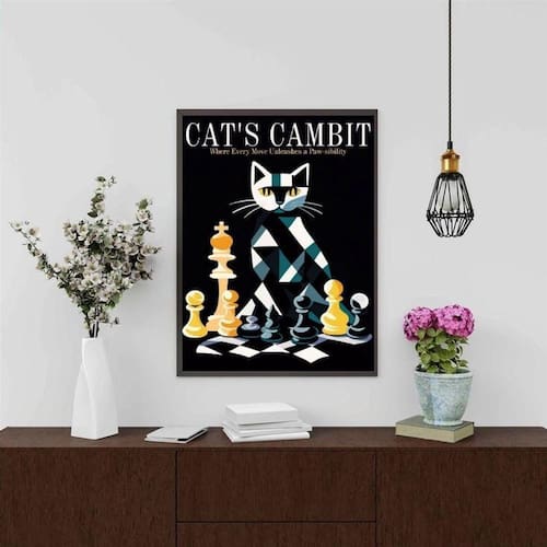 Quadro decorativo gato - jogo xadrez 45x34cm Cor: moldura preta Informações do produto tire todas as suas dúvidas no descritivo abaixo: decoração para quarto, sala, cozinha, escritório, área gourmet e muito mais. Chega de paredes vazias. Medidas - cada peça tem 45x34cm a3 . Material do papel - papel fotográfico brilhante de altíssima resolução acabamento - todos os quadros são acompanhados de uma película de acetato para proteção da imagem. - os quadros são embalados de forma segura com plástico bolha com camada dupla de acordo com o tamanho dos quadros. Garantia - garantia de 3 meses. Meu quadro chegou. Como posso fixá-lo Você precisa apenas de um martelo e um prego, pois os quadros já vão acompanhados de penduradores. Esta é a forma mais indicada. Caso prefira, você pode utilizar uma fita dupla face neste caso, sugerimos de alta qualidade para evitar que descole e seu quadro caia . Como posso limpar meu quadro A limpeza é feita como um móvel comum da sua casa. Apenas um pano seco ou espanador são suficientes para tal
