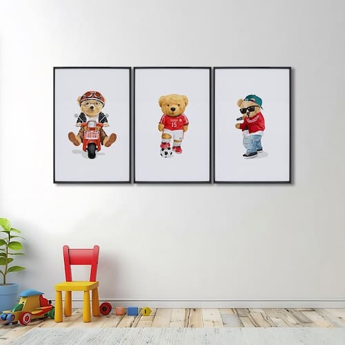 Quadro Decorativo Infantil Ursinhos Estilosos com 3 Telas cm ou cm de Parede para Quarto, Sala, Brinquedoteca, Escola, Creche, Sala de Jogos, Hall, Salão de Festas.Especificações Técnicas:Modelo: Ursinhos Estilosos;Material da Imagem: Papel premium fotográfico de alta qualidade;Material da Moldura: Madeira de reflorestamento revestida;Espessura da Moldura: 2,7cm de profundidade e 1,5cm frontal;Medidas: cm e cm;Acabamento: Fita Kraft;Acompanha: Suporte de serrilha para quadros e parafusos.Transforme seu espaço com elegância e sofisticação! Não perca a oportunidade de adquirir o exclusivo Quadro Decorativo Infantil Ursinhos Estilosos com 3 Telas a um preço incrível! Acompanha Fixação para Parede: Sim Ambiente Principal: Sala de Estar Cor: Preto Cor do Produto: Preto Espessura: 20 mm Espessura do Vidro: 3 mm Itens Inclusos: Quadro com 3 telas Marca: ARTE PRÓPRIA Material Principal: Madeira Maciça Medida de Cada Item: 60cm x 90cm Origem do Produto: Nacional Peso: 15 kg Possui Paspatur: Não Possui Vidro: Sim Tema da Estampa: Infantil Tipo de Quadro: Kit de quadros Vidro é Anti-Reflexo: Não Marca: ARTE PRÓPRIA