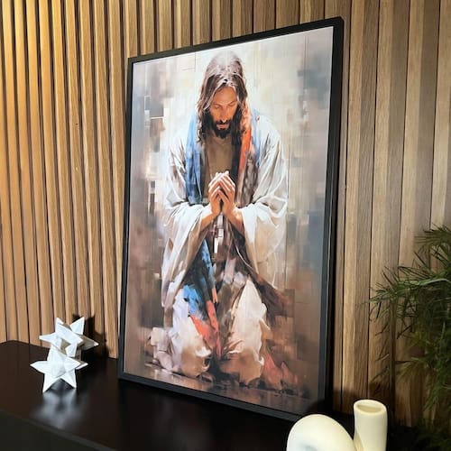 Quadro decorativo jesus em oração 45x34cm Cor: moldura preta Informações do produto tire todas as suas dúvidas no descritivo abaixo: decoração para quarto, sala, cozinha, escritório, área gourmet e muito mais. Chega de paredes vazias. Medidas - cada peça tem 45x34cm a3 . Material do papel - papel fotográfico brilhante de altíssima resolução acabamento - todos os quadros são acompanhados de uma película de acetato para proteção da imagem. - os quadros são embalados de forma segura com plástico bolha com camada dupla de acordo com o tamanho dos quadros. - de 3 meses. Meu quadro chegou. Como posso fixá-lo Você precisa apenas de um martelo e um prego, pois os quadros já vão acompanhados de penduradores. Esta é a forma mais indicada. Caso prefira, você pode utilizar uma fita dupla face neste caso, sugerimos de alta qualidade para evitar que descole e seu quadro caia . Como posso limpar meu quadro A limpeza é feita como um móvel comum da sua casa. Apenas um pano seco ou espanador são suficientes para tal