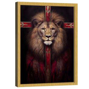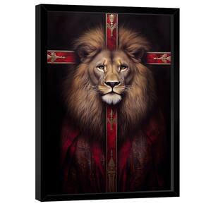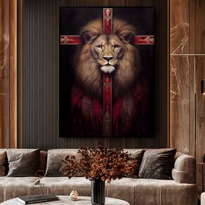 Quadro Decorativo Leão Cruz Vermelha Moldura Dourada e Vidro - 84x54cm -