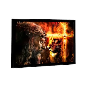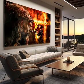 Quadro Decorativo Leão de Judá Cruz e Fogo Moldura Branca - 60x40cm -