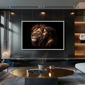 Quadro Decorativo Leão Divino e Jesus Moldura Preta - 118x78cm -