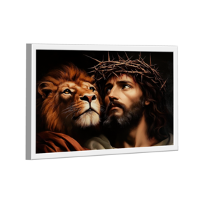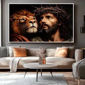Quadro Decorativo Leão e Jesus com Coroa de Espinhos Moldura Preta - 84x54cm -