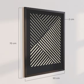 - Largura: 50 - Altura: 70 - "cor" da Armação: Preto e Branco - Quadros Decorativos: Fundo em mdf com acabamento da moldura em madeira com revestimento em polietileno - Temática do Quadro: Abstrato