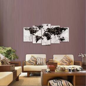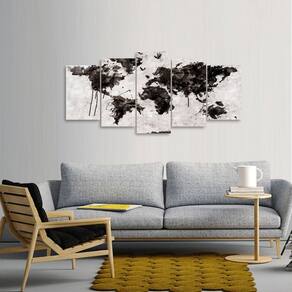 Quadro decorativo Mapa Mundi Animais Abstrato Dimensões do Produto: Tamanho total do produto: 125x60 cm Comprimento x Altura 02 Peças menores: 25x40 cm 02 Peças Médias: 25x50 cm 01 Peça Central: 25x60 cm. Espaçamento entre as peças de 1 cm - Tamanho total com espaçamentos 129x60 cm. Espessura do produto - 9 mm