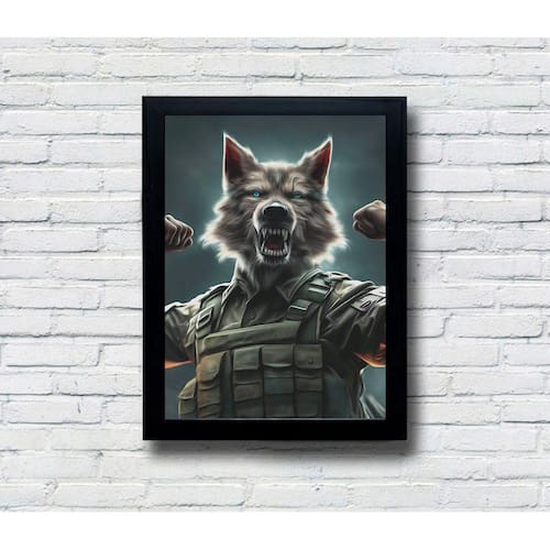 Nosso quadro decorativo de alta qualidade feito em MDF é uma afirmação de bom gosto. Com opções de moldura ou sem moldura, veja como a impressão excepcional realça cores vibrantes e arte exclusiva do "Soldado Lobo".