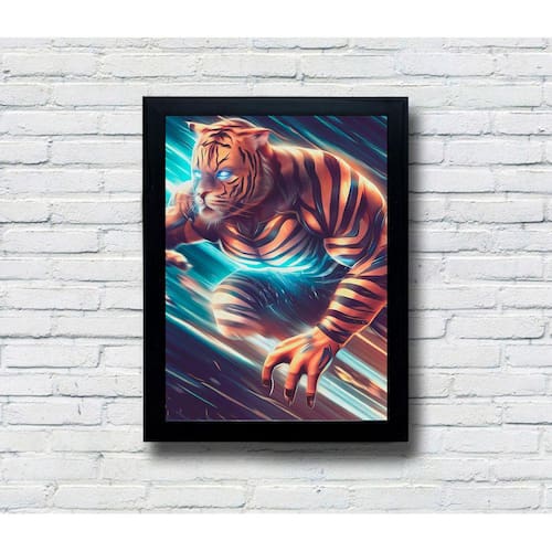 Celebre a estética requintada com nosso quadro decorativo de alta qualidade feito em MDF. Escolha entre moldura ou sem moldura, e veja como a impressão premium intensifica as cores vibrantes e a arte exclusiva do "Tigre Guerreiro".