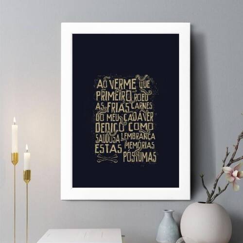 Quadro decorativo memorias postumas 33x24cm - com vidro Cor: moldura branca Informações do produto tire todas as suas dúvidas no descritivo abaixo: decoração para quarto, sala, cozinha, escritório, área gourmet e muito mais. Chega de paredes vazias medidas - cada peça tem 33x24cm a4 . Material do papel - papel fotográfico brilhante de altíssima resolução acabamento - todos os quadros são acompanhados de vidro para proteção da imagem. - moldura em madeira maciça na cor preta ou branca conforme produto escolhido e pendurador . - os quadros são embalados de forma segura com plástico bolha com camada dupla de acordo com o tamanho dos quadros. Garantia - garantia de 3 meses. Meu quadro chegou. Como posso fixá-lo Você precisa apenas de um martelo e um prego, pois os quadros já vão acompanhados de penduradores. Esta é a forma mais indicada. Como posso limpar meu quadro A limpeza é feita como um móvel comum da sua casa. Apenas um pano seco ou espanador são suficientes para tal