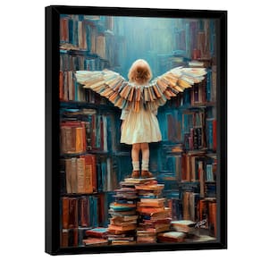 Quadro Decorativo Menina com Asas de Livro Moldura Preta e Vidro - 150x100cm -