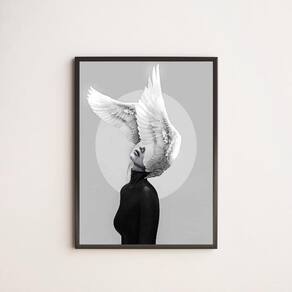 Quadro decorativo mulher com asas na cabeça 33x24cm - com vidro Moldura: madeira preta Informações do produto Decoração para quarto, sala, cozinha, escritório, área gourmet e muito mais. Chega de paredes vazias medidas - cada peça tem 33x24cm a4 . Material do papel - papel fotográfico brilhante de altíssima resolução Acabamento - todos os quadros são acompanhados de vidro para proteção da imagem. - Moldura em madeira maciça na cor preta e pendurador . - Os quadros são embalados de forma segura com plástico bolha com camada dupla de acordo com o tamanho dos quadros. - de 3 meses. Meu quadro chegou. Como posso fixá-lo Você precisa apenas de um martelo e um prego, pois os quadros já vão acompanhados de penduradores. Esta é a forma mais indicada. Como posso limpar meu quadro A limpeza é feita como um móvel comum da sua casa. Apenas um pano seco ou espanador são suficientes para tal