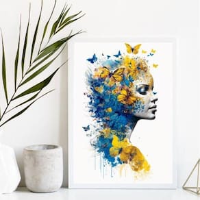 O Quadro Decorativo Mulher Borboletas Azul e Amarelo 45x34cm é perfeito para decorar diversos ambientes, como quarto, sala, cozinha, escritório, área gourmet e muito mais. Chega de paredes vazias! Com moldura de madeira branca, ele traz um toque de elegância e sofisticação para qualquer espaço.
