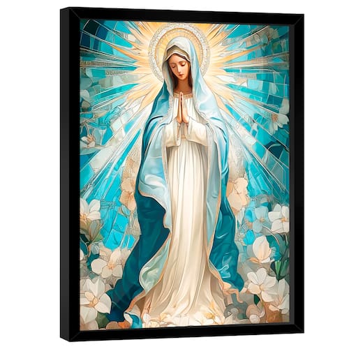 Quadro Decorativo Nossa Senhora Aparecida Branco e Azul Moldura Preta e Vidro - 180x105cm -