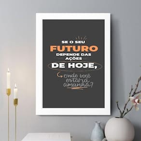 Quadro decorativo o seu futuro depende das ações de hoje 45x34cm Cor: moldura branca Informações do produto tire todas as suas dúvidas no descritivo abaixo: decoração para quarto, sala, cozinha, escritório, área gourmet e muito mais. Chega de paredes vazias. Medidas - cada peça tem 45x34cm a3 . Material do papel - papel fotográfico brilhante de altíssima resolução acabamento - todos os quadros são acompanhados de uma película de acetato para proteção da imagem. - os quadros são embalados de forma segura com plástico bolha com camada dupla de acordo com o tamanho dos quadros. Garantia - garantia de 3 meses. Meu quadro chegou. Como posso fixá-lo Você precisa apenas de um martelo e um prego, pois os quadros já vão acompanhados de penduradores. Esta é a forma mais indicada. Caso prefira, você pode utilizar uma fita dupla face neste caso, sugerimos de alta qualidade para evitar que descole e seu quadro caia . Como posso limpar meu quadro A limpeza é feita como um móvel comum da sua casa. Apenas um pano seco ou espanador são suficientes para tal