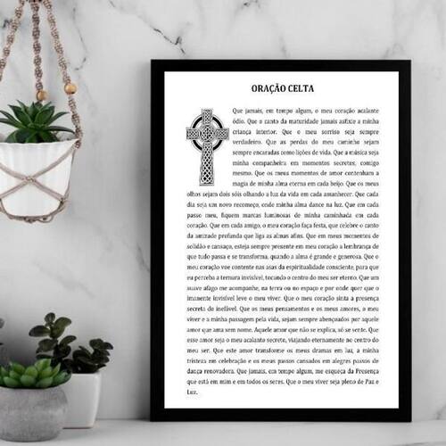 Quadro decorativo oração celta 45x34cm Cor: moldura preta Informações do produto tire todas as suas dúvidas no descritivo abaixo: decoração para quarto, sala, cozinha, escritório, área gourmet e muito mais. Chega de paredes vazias. Medidas - cada peça tem 45x34cm a3 . Material do papel - papel fotográfico brilhante de altíssima resolução acabamento - todos os quadros são acompanhados de uma película de acetato para proteção da imagem. - os quadros são embalados de forma segura com plástico bolha com camada dupla de acordo com o tamanho dos quadros. - de 3 meses. Meu quadro chegou. Como posso fixá-lo Você precisa apenas de um martelo e um prego, pois os quadros já vão acompanhados de penduradores. Esta é a forma mais indicada. Caso prefira, você pode utilizar uma fita dupla face neste caso, sugerimos de alta qualidade para evitar que descole e seu quadro caia . Como posso limpar meu quadro A limpeza é feita como um móvel comum da sua casa. Apenas um pano seco ou espanador são suficientes para tal Marca: Não Informado Ean: 7891234548238