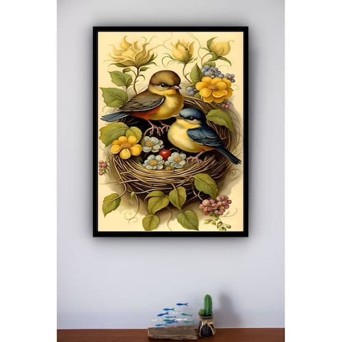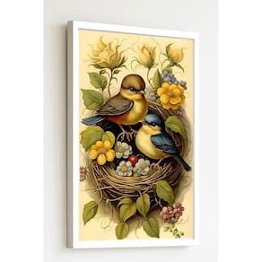Quadro Decorativo Pássaros Ninho Fruta Flores - 70x50cm - Cor: Moldura Branca