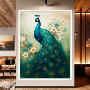 Quadro Decorativo Pavão Estilo Pintura Moldura Preta - 180x105cm -