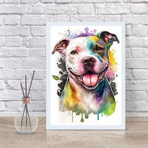 Quadro decorativo pitt bull happy aquarela 33x24cm - com vidro Moldura: madeira branca Informações do produto tire todas as suas dúvidas no descritivo abaixo: decoração para quarto, sala, cozinha, escritório, área gourmet e muito mais. Chega de paredes vazias medidas - cada peça tem 33x24cm a4 . Material do papel - papel fotográfico brilhante de altíssima resolução acabamento - todos os quadros são acompanhados de vidro para proteção da imagem. - moldura em madeira maciça na cor preta ou branca conforme produto escolhido e pendurador . - os quadros são embalados de forma segura com plástico bolha com camada dupla de acordo com o tamanho dos quadros. Garantia - garantia de 3 meses. Meu quadro chegou. Como posso fixá-lo Você precisa apenas de um martelo e um prego, pois os quadros já vão acompanhados de penduradores. Esta é a forma mais indicada. Como posso limpar meu quadro A limpeza é feita como um móvel comum da sua casa. Apenas um pano seco ou espanador são suficientes para tal Ean: 7890228602826