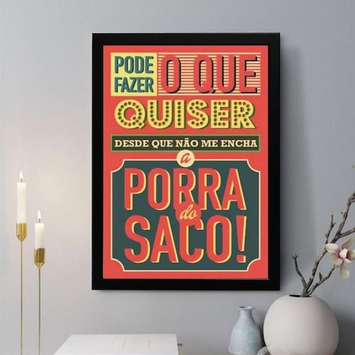 Quadro decorativo pode fazer o que quiser 33x24cm Cor: moldura branca Informações do produto tire todas as suas dúvidas no descritivo abaixo: decoração para quarto, sala, cozinha, escritório, área gourmet e muito mais. Chega de paredes vazias medidas - cada peça tem 33x24cm a4 . Material do papel - papel fotográfico brilhante de altíssima resolução acabamento - todos os quadros são acompanhados de uma película de acetato para proteção da imagem. - os quadros são embalados de forma segura com plástico bolha com camada dupla de acordo com o tamanho dos quadros. Garantia - garantia de 3 meses. Meu quadro chegou. Como posso fixá-lo Você precisa apenas de um martelo e um prego, pois os quadros já vão acompanhados de penduradores. Esta é a forma mais indicada. Caso prefira, você pode utilizar uma fita dupla face neste caso, sugerimos de alta qualidade para evitar que descole e seu quadro caia . Como posso limpar meu quadro A limpeza é feita como um móvel comum da sua casa. Apenas um pano seco ou espanador são suficientes para tal