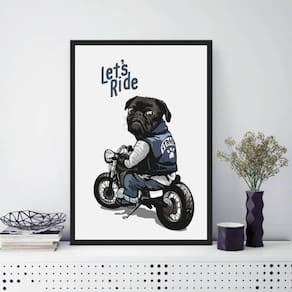 Quadro decorativo pug lets ride 33x24cm - com vidro Moldura: madeira preta Informações do produto tire todas as suas dúvidas no descritivo abaixo: decoração para quarto, sala, cozinha, escritório, área gourmet e muito mais. Chega de paredes vazias medidas - cada peça tem 33x24cm a4 . Material do papel - papel fotográfico brilhante de altíssima resolução acabamento - todos os quadros são acompanhados de vidro para proteção da imagem. - moldura em madeira maciça na cor preta e pendurador . - os quadros são embalados de forma segura com plástico bolha com camada dupla de acordo com o tamanho dos quadros. - de 3 meses. Meu quadro chegou. Como posso fixá-lo Você precisa apenas de um martelo e um prego, pois os quadros já vão acompanhados de penduradores. Esta é a forma mais indicada. Como posso limpar meu quadro A limpeza é feita como um móvel comum da sua casa. Apenas um pano seco ou espanador são suficientes para tal