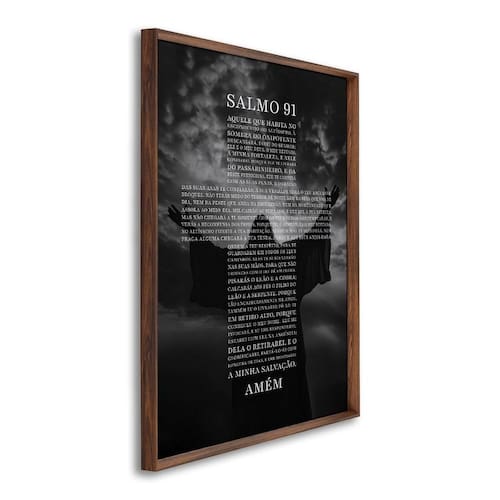 Quadro Decorativo Religioso Bíblia Salmo 91 com 1 Tela cm ou cm de Parede para Sala, Quarto, Cozinha, Lavabo, Escritório, Hall, Recepção, Barbearia, Salão Igreja, Templo.Especificações Técnicas:Modelo: Salmo 91;Material da Imagem: Papel premium fotográfico de alta qualidade;Material da Moldura: Madeira de reflorestamento revestida;Espessura da Moldura: 2,7cm de profundidade e 1,5cm frontal;Medidas: cm ou cm;Acabamento: Fita Kraft;Acompanha: Suporte de serrilha para quadros e parafusos.Transforme seu espaço com elegância e sofisticação. Não perca a oportunidade de adquirir o exclusivo Quadro Religioso Decorativo Salmo 91 com 1 Tela a um preço incrível! Acompanha Fixação para Parede: Sim Ambiente Principal: Sala de Estar Cor: Marrom Cor do Produto: Marrom Espessura: 20 mm Itens Inclusos: 1 Quadro com 1 tela Marca: ARTE PRÓPRIA Material Principal: Madeira Maciça Origem do Produto: Nacional Peso: 6 kg Possui Paspatur: Não Possui Vidro: Não Tema da Estampa: Frases Tipo de Quadro: Quadro Marca: ARTE PRÓPRIA
