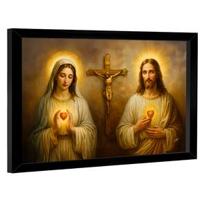 Quadro Decorativo Sagrado Coração de Jesus e Maria Moldura Preta e Vidro - 118x78cm -