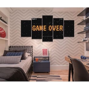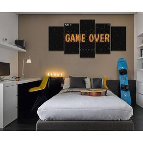 Quadro Decorativo Sala Quarto Escritório Game Over Os quadros decorativos são uma tendência e excelente ideia para quem desejar realmente mudar o visual do seu ambiente, deixando ele com a sua cara. São Utilizados para decorar vários ambientes seja um comércio, sua sala, quarto, área de lazer ou escritório, são lindos, leves e fáceis de instalar. Também pode quebrar aquele galho tampando aquelas pequenas imperfeições indesejadas da parede, com um toque super elegante. Decorar o seu ambiente é sempre um momento muito especial. Características do Produto: Tamanho total: 130cm comprimento X 63cm altura Peças menores: 25x40 cm | Peças médias: 25x51 cm | Peça central: 25x63 cm Espaçamento entre as peças: 1 cm a 2 cm Espessura do produto - 2 CM Quadro pronto para pendurar no local desejado. Material e Acabamentos: Tela em Tecido com impressão digital ecológica, de alta tecnologia, Atóxica e sem cheiro, proporcionando imagens de alta qualidade e durabilidade. Bordas com a extensão da própria imagem nas laterais, sendo uma tela painel. Tecido esticado no chassi de madeira e grampeado no verso, com suportes triangulares para a fixação. Um pouco mais sobre o Tecido O tecido é sintético fechado, sua flexibilidade evita que a impressão fique com aparência pigmentada, caso o material seja esticado. É muito utilizado em museus, exposições de arte, eventos, na identificação e principalmente Na decoração de ambientes. Como fixar no local: Fixação feita de forma tradicional, basta colocar dois parafusos ou dois pregos de acordo com os engates do quadro, Deixando espaçamento entre as peças de 1,5 CM ou até no máximo 2,5 CM. Limpeza após fixação: Para a limpeza basta apenas um espanador ou pano macio, sem conter elementos químicos. Objetos/móveis ilustrativos da imagens não inclusos somente o quadro. O Produto pode de ocorrer de ter uma leve diferença de tom de cor da que esta no monitor do seu computador. O Produto é produzido e postado em até 3 dias úteis após a confirmação do pagamento.