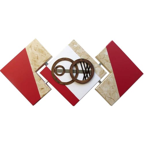 Dimensões: 120x57cm - 4 cm de espessura. Quadro formado por 3 painéis em forma de losango, interligados por estrutura de alumínio. Painel moderno decorativo, pintura acrílica, com textura e apliques em mdf. Cor: vermelho vivo.