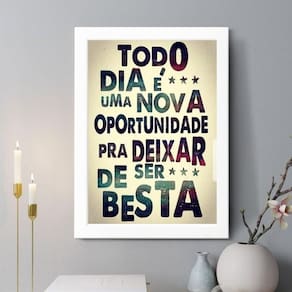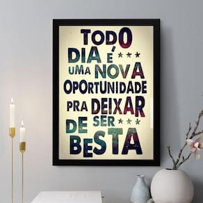 Quadro decorativo todo dia é uma nova oportunidade 24x18cm - com vidro Cor: moldura branca Informações do produto tire todas as suas dúvidas no descritivo abaixo: decoração para quarto, sala, cozinha, escritório, área gourmet e muito mais. Chega de paredes vazias medidas - cada peça tem 24x18cm a5 . Material do papel - papel fotográfico brilhante de altíssima resolução acabamento - todos os quadros são acompanhados de vidro para proteção da imagem. - moldura em madeira maciça na cor preta ou branca conforme produto escolhido e pendurador . - os quadros são embalados de forma segura com plástico bolha com camada dupla de acordo com o tamanho dos quadros. Garantia - garantia de 3 meses. Meu quadro chegou. Como posso fixá-lo Você precisa apenas de um martelo e um prego, pois os quadros já vão acompanhados de penduradores. Esta é a forma mais indicada. Como posso limpar meu quadro A limpeza é feita como um móvel comum da sua casa. Apenas um pano seco ou espanador são suficientes para tal