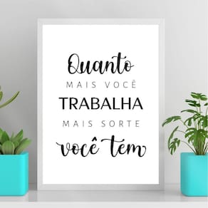 Quadro decorativo trabalho e sorte 24x18cm Cor: moldura preta Informações do produto tire todas as suas dúvidas no descritivo abaixo: decoração para quarto, sala, cozinha, escritório, área gourmet e muito mais. Chega de paredes vazias medidas - cada peça tem 24x18cm a5 . Material do papel - papel fotográfico brilhante de altíssima resolução acabamento - todos os quadros são acompanhados de uma película de acetato para proteção da imagem. - os quadros são embalados de forma segura com plástico bolha com camada dupla de acordo com o tamanho dos quadros. Garantia - garantia de 3 meses. Meu quadro chegou. Como posso fixá-lo Você precisa apenas de um martelo e um prego, pois os quadros já vão acompanhados de penduradores. Esta é a forma mais indicada. Caso prefira, você pode utilizar uma fita dupla face neste caso, sugerimos de alta qualidade para evitar que descole e seu quadro caia . Como posso limpar meu quadro A limpeza é feita como um móvel comum da sua casa. Apenas um pano seco ou espanador são suficientes para tal