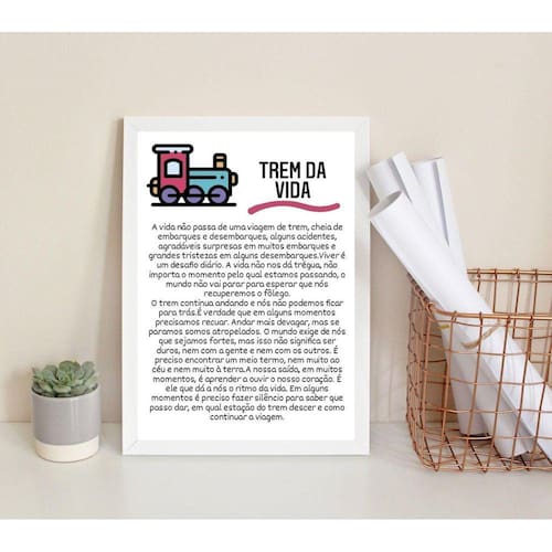 Quadro decorativo trem da vida 24x18cm - com vidro Moldura: madeira preta Informações do produto tire todas as suas dúvidas no descritivo abaixo: decoração para quarto, sala, cozinha, escritório, área gourmet e muito mais. Chega de paredes vazias medidas - cada peça tem 24x18cm a5 . Material do papel - papel fotográfico brilhante de altíssima resolução acabamento - todos os quadros são acompanhados de vidro para proteção da imagem. - moldura em madeira maciça na cor preta ou branca conforme produto escolhido e pendurador . - os quadros são embalados de forma segura com plástico bolha com camada dupla de acordo com o tamanho dos quadros. Garantia - garantia de 3 meses. Meu quadro chegou. Como posso fixá-lo Você precisa apenas de um martelo e um prego, pois os quadros já vão acompanhados de penduradores. Esta é a forma mais indicada. Como posso limpar meu quadro A limpeza é feita como um móvel comum da sua casa. Apenas um pano seco ou espanador são suficientes para tal Ean: 7899612632777