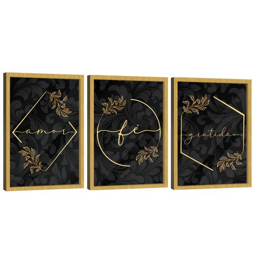 Quadro Decorativo Trio Gratidão, Fé e Amor Moldura Dourada e Vidro - 60x40cm -
