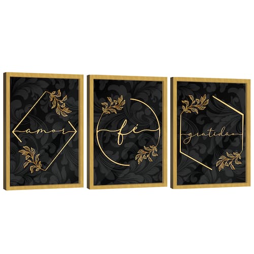 Quadro Decorativo Trio Gratidão, Fé e Amor Moldura Dourada e Vidro - 84x54cm -