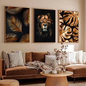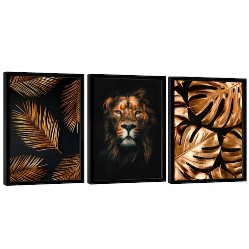 Quadro Decorativo Trio Leão e Folhagem Moldura Preta - 60x40cm -